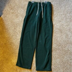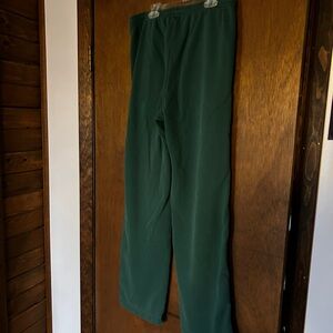 Size is Medium and fit is true to size. Color of pants is a true emerald green. No longer available online. Features drawstrings inside the waistband. Can be rolled up at the waist.