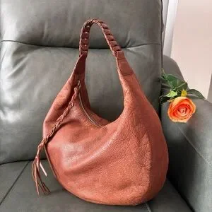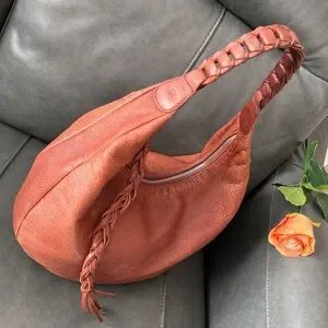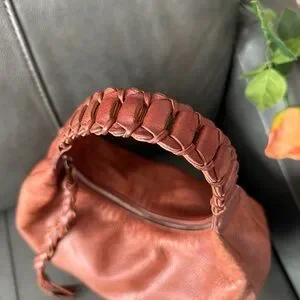 Stylish brown leather bag with a unique braided handle. Perfect for any occasion.