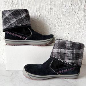 Timberland and Smartwool women's size 9 cozy winter boot. Black suede leather upper can be worn at mid-calf height or rolled down to reveal the black, grey and purple plaid cuff with button. Fabric lining and insole; rubber outsole. Excellent condition.