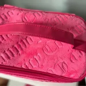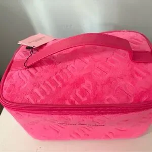Bold pink cosmetic case with embossed logo. Perfect for travel or daily use. Stylish and functional.