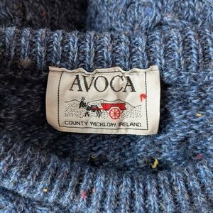 This is a gorgeous authentic Irish wool sweater from Avoca, made in County Wicklow, Ireland. It features a classic cable‑knit pattern and is crafted from Pure New Wool, giving it a warm, substantial feel.