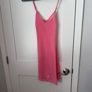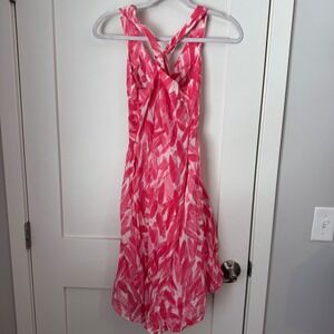 Vibrant pink and white abstract print dress crafted from lightweight 100% cotton. This breezy piece features a flattering V-neckline with a gathered bodice and a unique cross-back strap design. It comes complete with a matching pink polyester slip for added coverage and comfort, making it a perfect choice for warm-weather outings or tropical vacations.