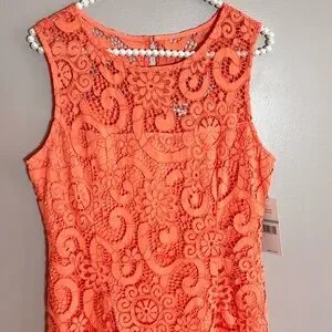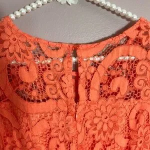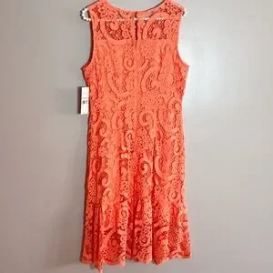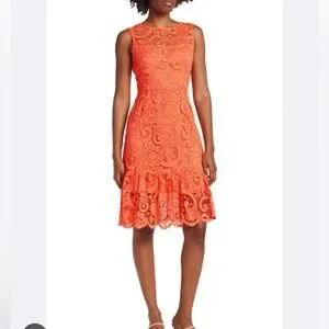 Nanette Lepore sleeveless flounce midi dress in the color vivid coral, which is a vibrant orange with a pinkish hue - Beautiful lace overlay with unlined (see through) chest - Ruffle detail around bottom - Rear zip & clasp closure w/ button closure keyhole opening - new with tags - pit to pit is 17.5” - length from highest shoulder is 41” - lining is 35” from highest shoulder - the color is difficult to capture, but is as close to actual as possible (actual is slightly more vibrant) - will vary in different light settings - Gorgeous!