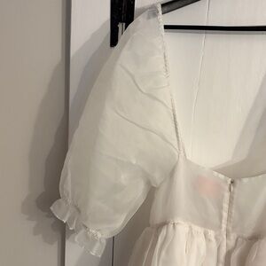 Tags: selkie puff sleeve dress, white organza midi dress, ethereal romantic style, cottagecore aesthetic, dreamy flowy silhouette, special occasion dress, bridal shower outfit, engagement photo dress, garden party dress, whimsical feminine look, fairytale fashion, twirl-worthy skirt, lightweight airy fabric, statement sleeve dress, summer event outfit, whimsical, cottagecore