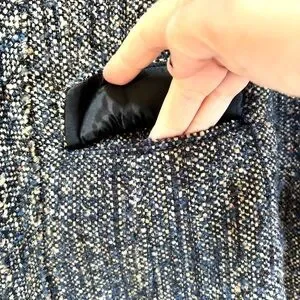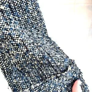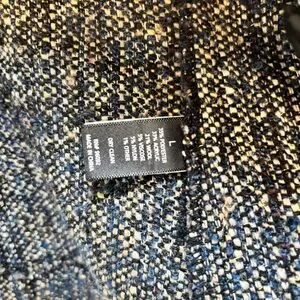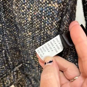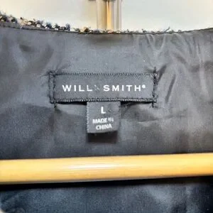 Hello, love! Sophisticated tweed blazer with a textured finish. Ideal for professional and casual settings. This is a Willi Smith blazer that is large but fits like a small. Measurements are below. There is no stretch in this blazer. It is a nobby bumpy tweed material. It has two pockets in the front. Super unique, metal hook and eye hardware on the front. There are five of them. The blazer has multiple colors woven throughout it as you can see in the pictures, black Creme blue even little tiny bits here and there of a little bit of red. The label on the inside that says Willi Smith has a little bit of wear to it the rest of the jacket is in good used condition. Wool blend. All of your questions and offers are welcomed. Xox