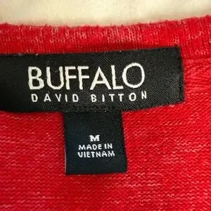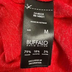 , lightweight Buffalo David Bitton sweatshirt in a vibrant red knit with subtle heart print throughout. Features raglan sleeves, relaxed fit, and a drapey viscose blend that feels elevated compared to traditional cotton fleece.