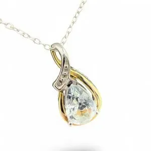 Pale blue pear cut aquamarine is the center of this sterling silver and 10k yellow gold pendant that is accented by diamond chips. Pendant hangs on an 18 inch long sterling silver chain with a spring ring clasp. Aquamarine is the birthstone for March.
