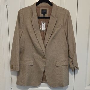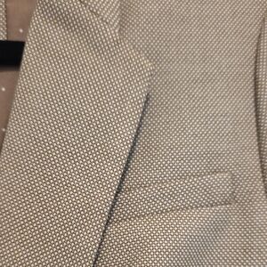Chic beige blazer with classic design. Features button closure and front pockets. Ideal for professional settings.