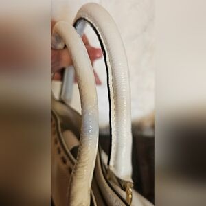 Chic ivory satchel with crossbody strap and elegant gold accents. beautiful piece for spring. soft leather in good clean condition. Ideal for stylish outings.