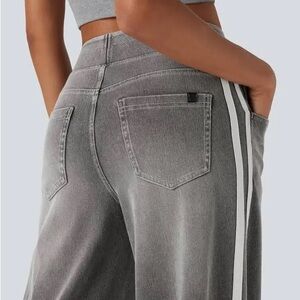 Elevate your casual look with these stylish Halara wide-leg jeans. Designed for comfort and flair, they feature a flattering elastic waistband and a chic double stripe down each side, adding a sporty yet sophisticated touch.