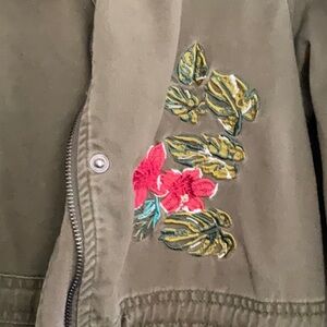 Stylish olive green jacket featuring vibrant floral embroidery. Perfect for a casual look.
