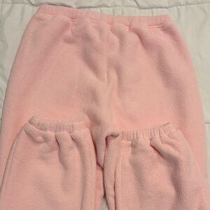 Soft and comfortable pink fleece pants. Features a festive tree design for added charm.