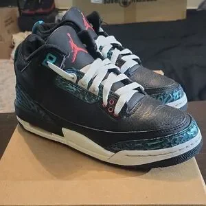 Rare Nike Air Jordan 3 Retro special edition "Moto," a kids-exclusive release inspired by Michael Jordan's passion for motorsports. This sneaker features a black tumbled leather upper accented by "Hyper Jade" teal in the elephant-print overlays and "Siren Red" Jumpman logos on the tongue. Boys 5Y Girls 6.5