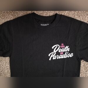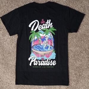 Assholes Live Forever, men's size small Black tee featuring a vibrant skeleton graphic with palm trees and a pool. Bold words and personality add a unique touch. All questions welcome.