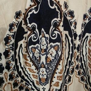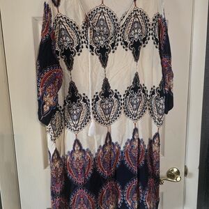 Chic bohemian midi dress featuring navy and cream hues. Perfect for casual outings or special occasions.
