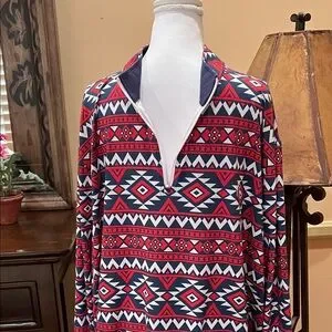 Stylish Rhoback polo with vibrant geometric patterns. Features a mix of red and blue colors. Perfect for casual outings.
