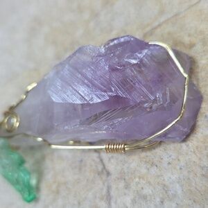 Elegant pendant featuring a stunning purple gemstone with green accents. Perfect for adding a touch of color to any outfit.