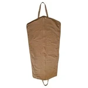 Burberry London England garment bag provides a sophisticated way to protect and transport your finest apparel. Crafted from a lightweight cotton fabric in tan, this authentic cover features the iconic logo boldly printed on the front. It is designed with a full-length front zipper for easy access, silver-tone hardware including branded snap buttons, and integrated top and bottom handles that allow the bag to be folded and carried with ease. Ideal for suits, dresses, or coats, it ensures your designer pieces remain dust-free and wrinkle-resistant during travel without the added weight.
