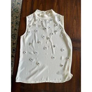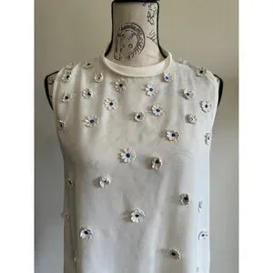 Sleeveless. Sheer creamy off white shirt with blue and white daisy. Peep hole with buttons in the back.