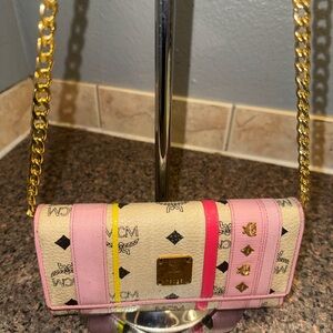Stylish MCM crossbody bag in pink and cream. Features a chic design with gold accents, perfect for any occasion. This is excellent used condition. It is a wallet with an unbranded. Crossbody chain added the wallet has minor fading, and rubbing to the leather no major callouts all snaps and zipper closures work. Please see all photos and ask questions as all sales are final.