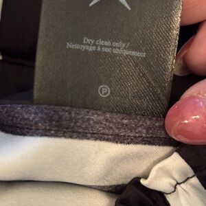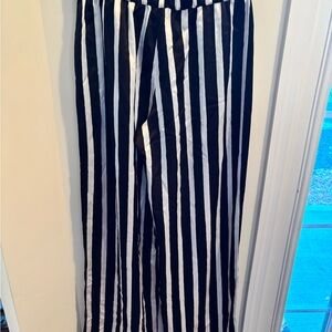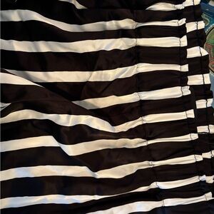 Pair of pull on black and white striped pants. Pants have a silky texture. Wide elastic waistband. Pants have pockets.