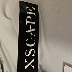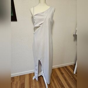 Dress has only been washed but the label inside has been cut out, It isn't a bright white color, more of a light Grey. Cut out Side and great Slit, great for an evening party, or special event.