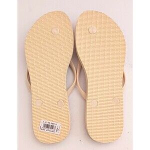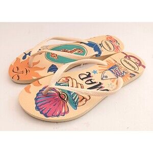 New with tags.The product is a pair of Havaianas flip flops in a vibrant yellow color, featuring a beach print insole. These slip-on sandals have a flat heel and are made of rubber, perfect for the summer season. They are designed for women who want to make a stylish statement while enjoying the beach or pool. Made in Brazil, these Havaianas flip flops embody the brand's signature style and quality craftsmanship. The size is marked with conflicting info, stating both EU 41/42 and EU 39/40. They fit to EU 40 US 9. The length measured on the bottom sole is 10" length.
