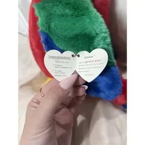 The Ty Beanie Buddies Jabber Parrot is a 10" stuffed plush toy made by Ty in 1999. This retired Buddy Baby features a parrot character from the Bird family, with a PE Pellet filler for a soft and cuddly feel. Recommended for children aged 3 and up, this collectible toy is perfect for fans of Beanie Buddies and plush toys. Made in China, this authentic Ty product is a must-have for any enthusiast of retro toys and stuffed animals.