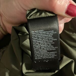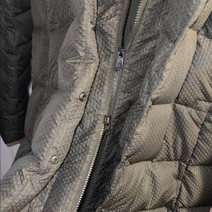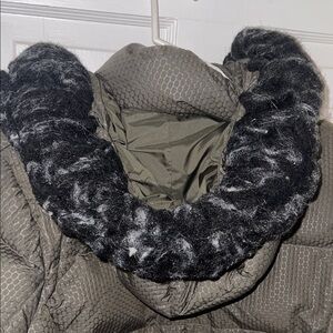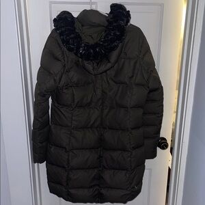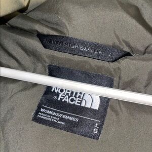 North face women’s large. Stay warm and stylish with this olive green long puffer jacket. Used. Was washed and dried - fur on hood slightly damaged (see photos) still a great winter coat