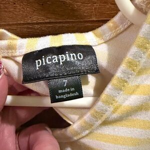 Picapino size 7; excellent condition; smoke free home. This adorable kids romper features a playful yellow and white stripe pattern. Perfect for sunny days, it offers comfort and style for your little one.