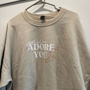 Comfortable Gildan crewneck sweater with Harry Styles song quote ‘Just let me adore you’. Soft fabric, good condition no noticeable flaws. Ideal for casual wear. Tan color, size 2XL. 50% cotton 50% polyester.