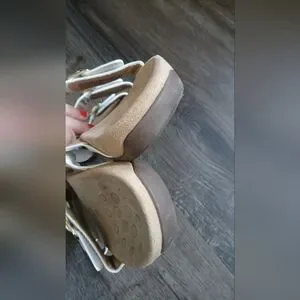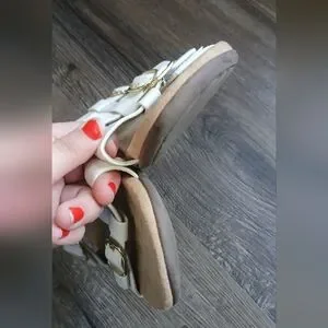 Stylish white sandals featuring multiple straps and gold buckles. Perfect for casual outings.