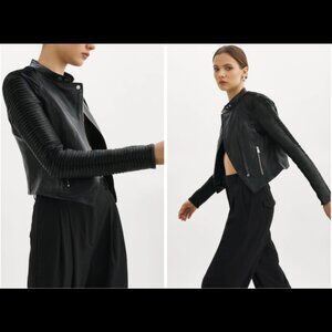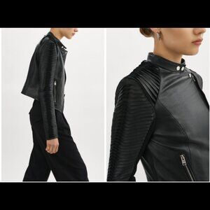 Edgy, structured, and effortlessly cool — this LAMARQUE genuine leather moto jacket is a statement piece with elevated detail. Featuring dramatic ribbed pleated sleeves and a sleek asymmetrical zip front, it delivers that high-end, modern biker aesthetic the brand is known for.