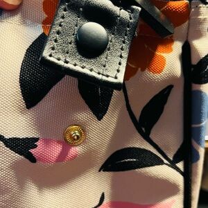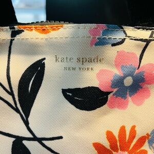Kate Spade insulated lunch bag with vibrant floral design. Features black handles. Has interior pouch.