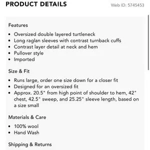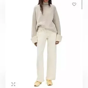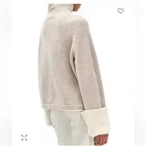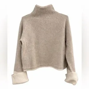 Elegant cream turtleneck sweater. Features ribbed texture. Long sleeves with wide cuffs. Perfect for cozy style.