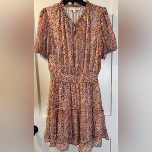 Step out in style with this elegant paisley midi dress, showcasing vibrant pink, gold and orange tones. Perfect for any occasion.