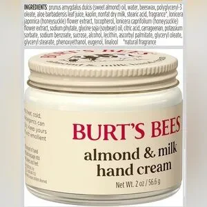 SCENTED HAND CREAM: Burt's Bees almond and milk natural origin hand cream, smoothens dry, damaged skin on your hands while the nutty almond scent relaxes senses
