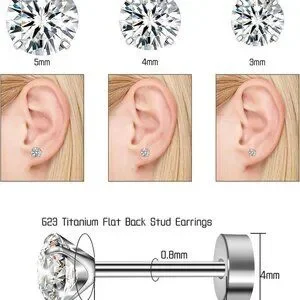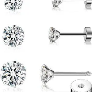 Features: This set includes three pairs of lightweight, comfortable stud earrings with hypoallergenic G23 titanium. Each pair showcases sparkling cubic zirconia stones, with a sleek flat back design and screw-back closure for a secure fit. Great for cartilage, helix, tragus, conch, and other piercings. Perfect for wearing alone or layering!