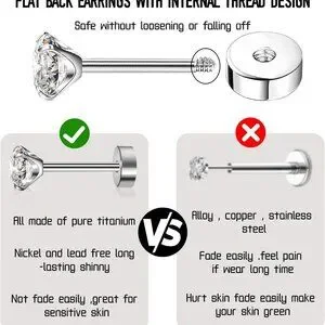 Flat Back Earrings Titanium CZ Stud 3 Pair Hypoallergenic Cartilage Jewelry