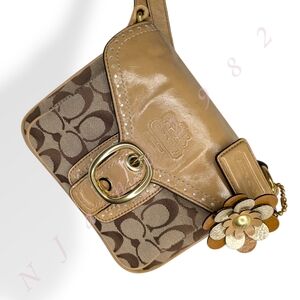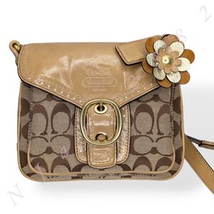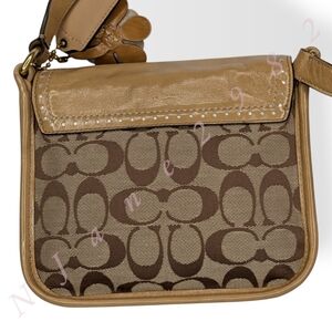 Coach Signature Bleecker Canvas Flap Crossbody Tan Patent Leather Buckle Bag