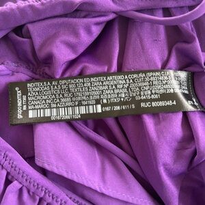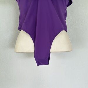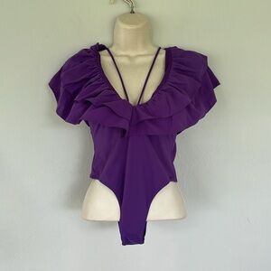 ZARA Swimwear royal purple deep-v neckline oversized ruffle shoulder strappy high cut one piece bathing suit size small. The thin straps can be worn straight or crisscrossed. This is labeled as swimwear but could also be worn as a bodysuit. Brand new never worn!