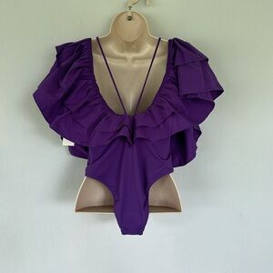 ZARA Swimwear purple deep-v ruffle strappy high cut one piece bathing suit small