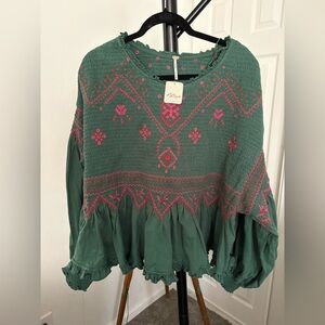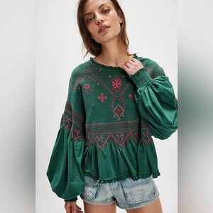 NWT FREE PEOPLE Holly Long Sleeve Knit Top | Green Combo MSRP $128 Size XL