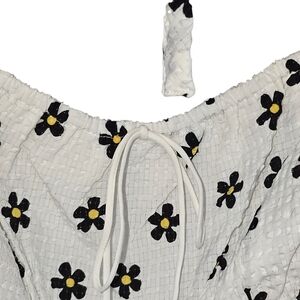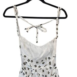 This dreamy white midi features a black daisy floral print, gathered bust with functional drawstring, adjustable straps, and a stunning open back with tie detail. Elastic at back waist for comfort and side seam pockets. Pull-on style and partially lined.