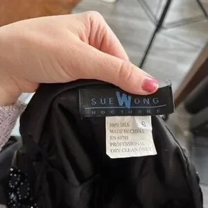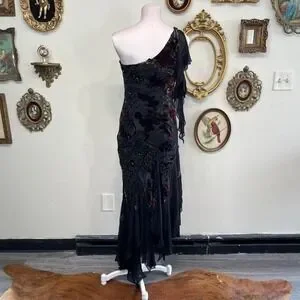 Elegant and dramatic vintage Sue Wong Nocturne evening gown crafted from luxurious black silk with stunning floral beadwork and a romantic one-shoulder silhouette. This show-stopping formal dress features sheer chiffon draping and an ethereal layered hem that moves beautifully. A timeless statement piece perfect for galas, weddings, or special occasions.