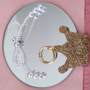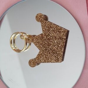 Set of keychains featuring a glittery gold crown and a purple balloon dog. Includes a pearl bow accent beaded clasp.