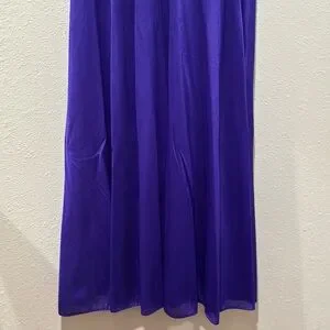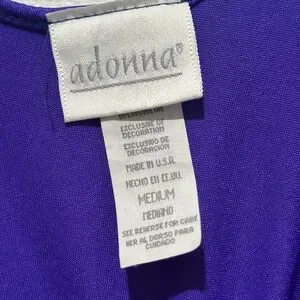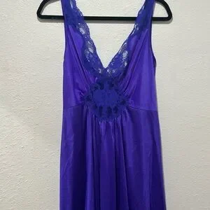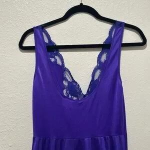 Vintage Adonna satin nightgown in vibrant purple with lace trim detailing. Features soft satin fabric, flattering drape, and feminine lace neckline. Can be worn as sleepwear or styled as a slip dress.