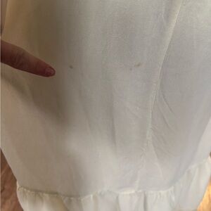 A few small, faint spots on the skirt (shown in photos). They are subtle and do not affect wearability. Priced accordingly.