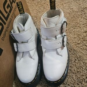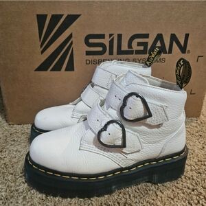Chic white platform shoes. Features black heart buckles. Modern and bold style.