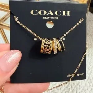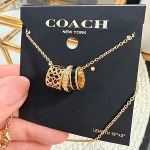 NWT- Coach necklace with gold, black, and studded ring pendants. Adds elegance to any look.